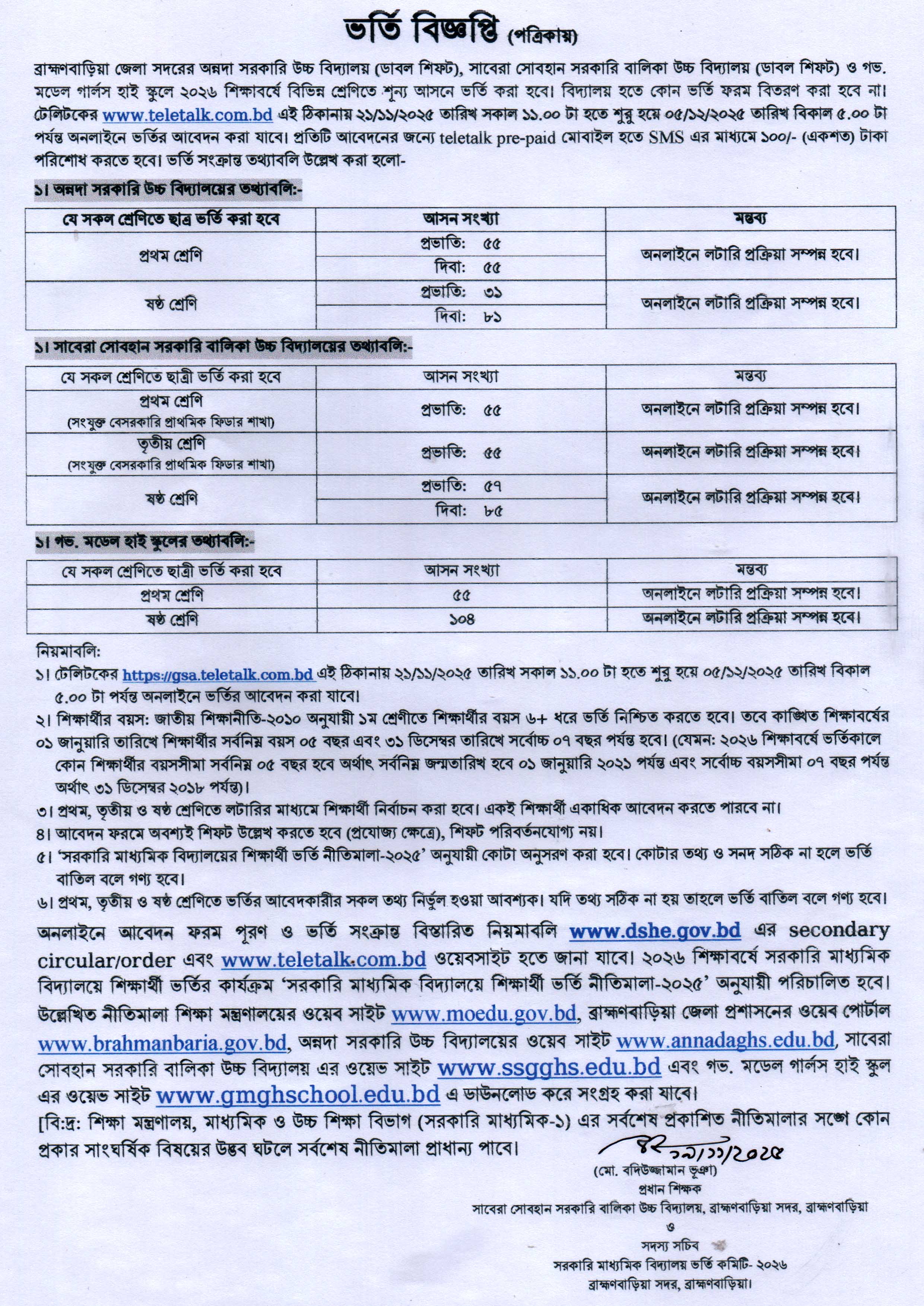 লটারী ভর্তি বিজ্ঞপ্তি-২০২৬